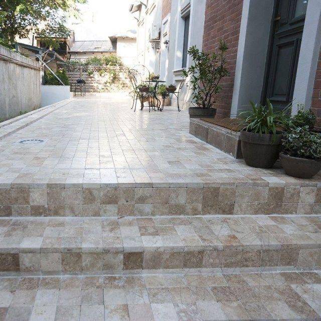 Robuste et résistant aux intempéries, le carrelage en travertin est un choix idéal pour les aménagements extérieurs.